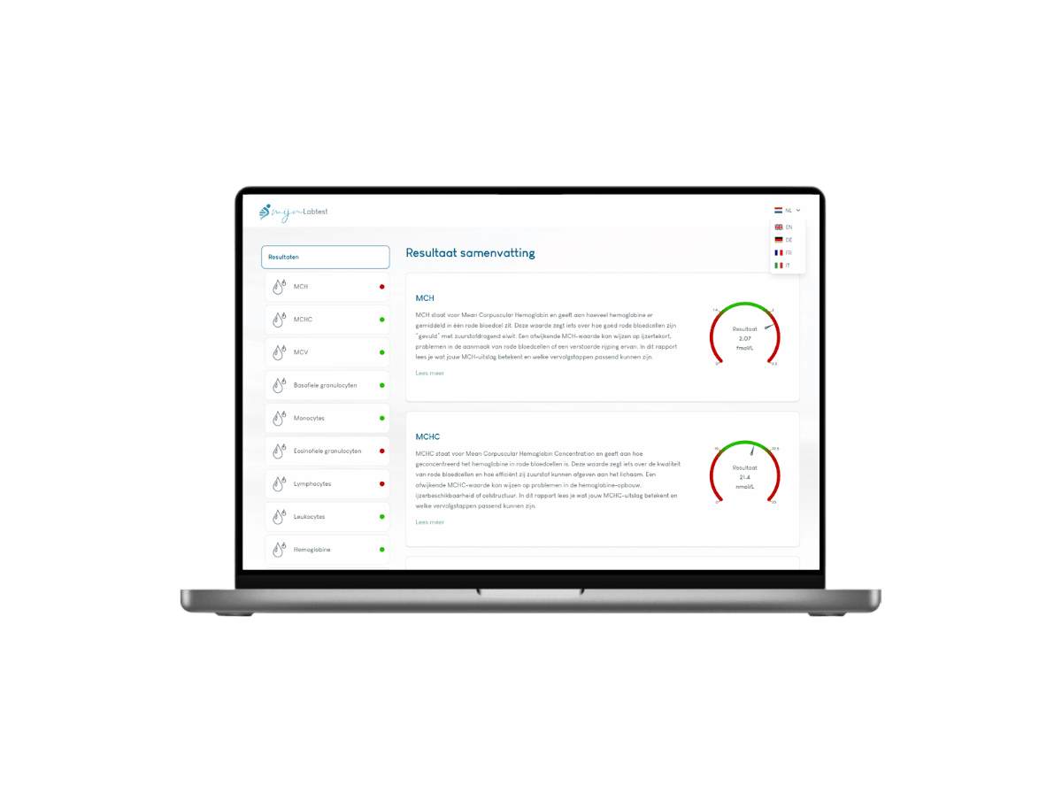 Na de afname en het retour sturen van je bloedtest, ontvang je het resultaat via een beveiligd bericht. In dit resultaat wordt meer uitleg gegeven over de verschillende onderdelen waaruit het bloedbeeld bestaat zoals rode bloedcellen en verschillende soorten witte bloedcellen. Verder lees je natuurlijk jouw testuitslag en wordt uitgelegd waar de uitslag precies voor staat.