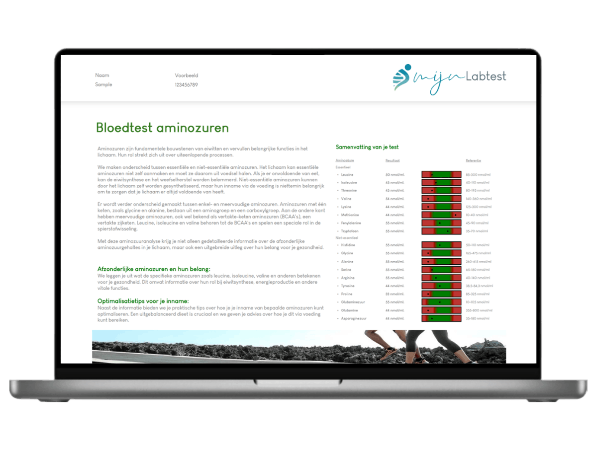 Wat kun je van het testresultaat verwachten? Je ontvangt een gedetailleerd rapport. In dit rapport staat meer uitleg over aminozuren en vind je jouw waarde voor elk van de 23 aminozuren uit de test. Aan de hand van een visual zie je in één oogopslag of jouw waarde uitkomt in het referentiebereik.