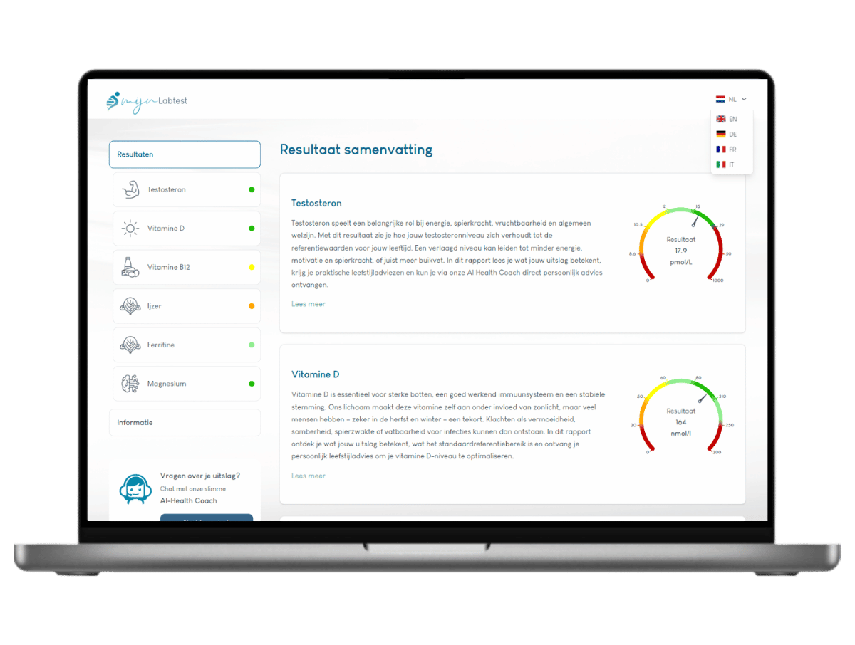 Je ontvangt een helder en persoonlijk rapport waarin jouw sportgerelateerde bloedwaarden overzichtelijk worden uitgelegd. Zo zie je direct hoe belangrijke biomarkers zoals vitamine D, vitamine B12, ijzer, ferritine, magnesium en testosteron zich verhouden tot het referentiebereik en wat dit betekent voor je sportprestaties en herstel.