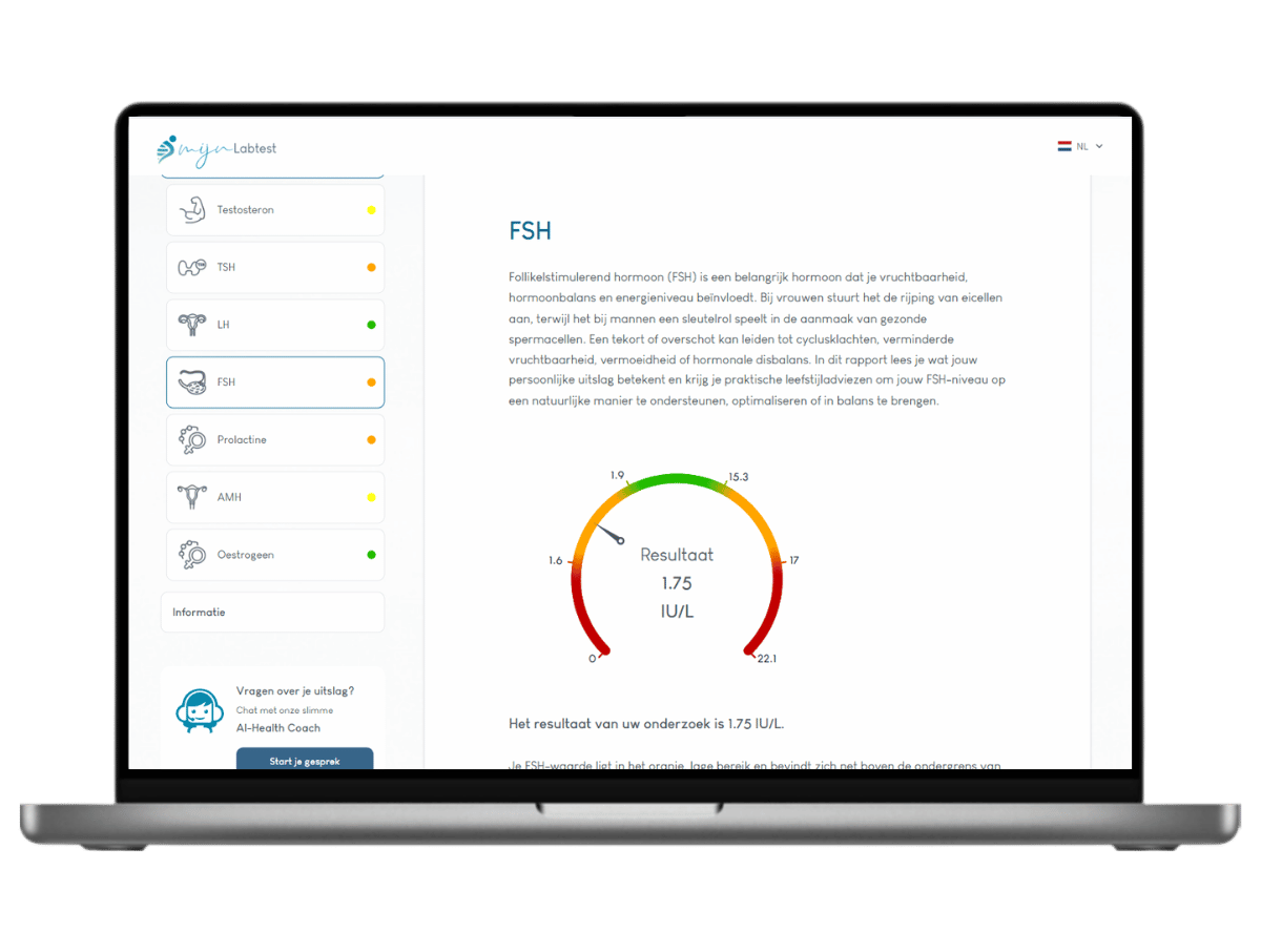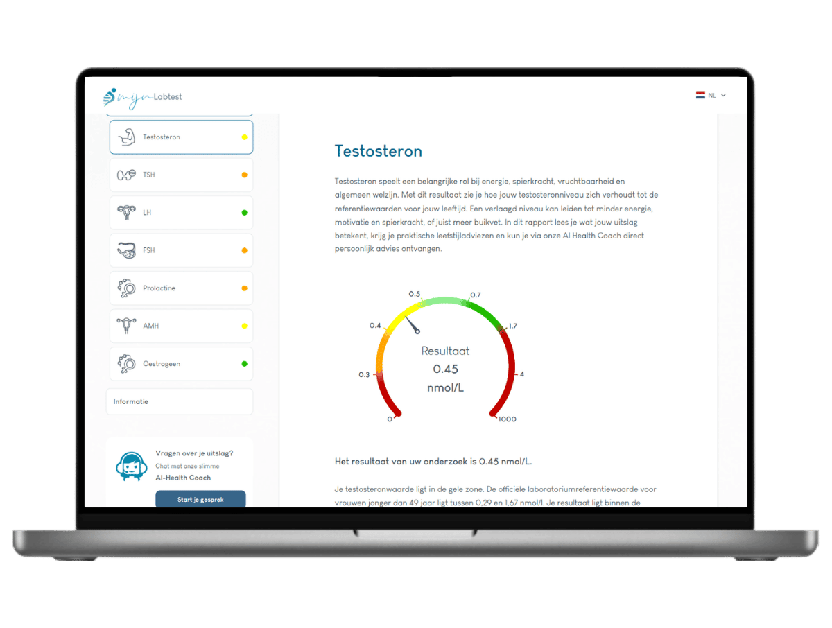 Daarnaast krijg je toegang tot onze geïntegreerde AI Health Coach. Hiermee kun je direct chatten over je uitslag en al je vragen stellen, zodat je jouw hormonen beter leert begrijpen