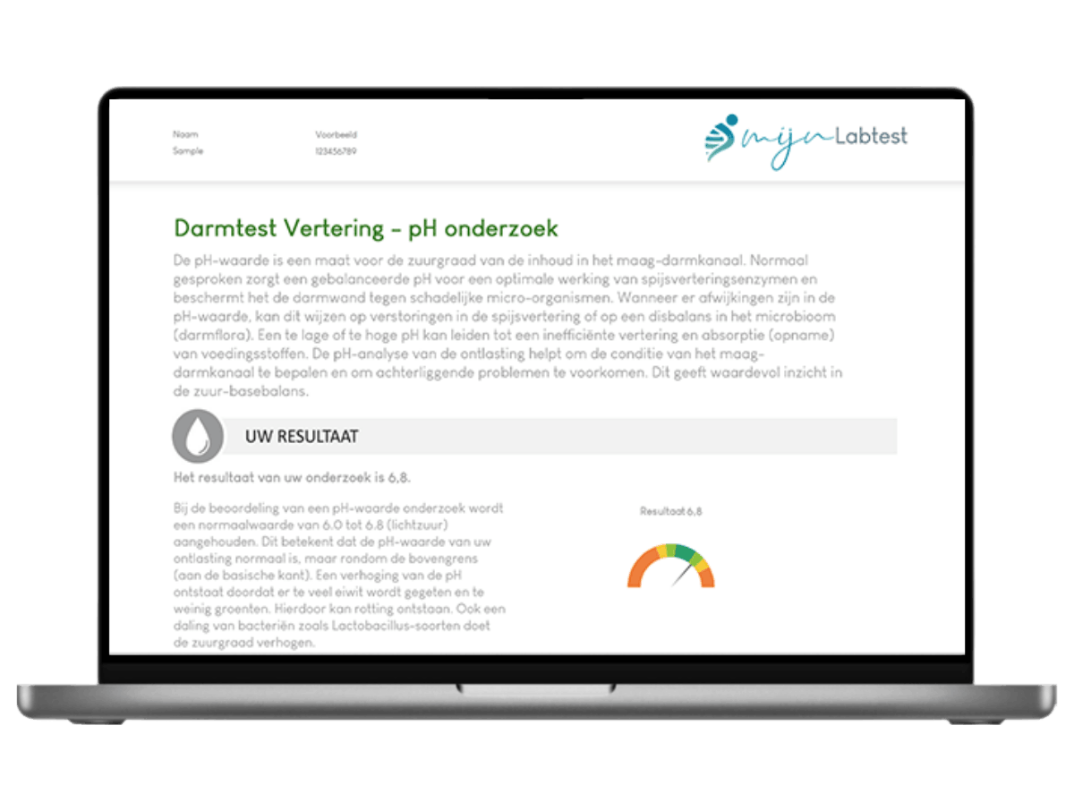 Na het afnemen en retourneren van de verteringstest ontvang je de resultaten via een beveiligd bericht. In dit rapport lees je jouw testuitslag en wordt uitgelegd wat de verschillende waarden betekenen. Hierdoor krijg je een helder beeld van hoe goed jouw spijsvertering functioneert en of je eten optimaal verteert.