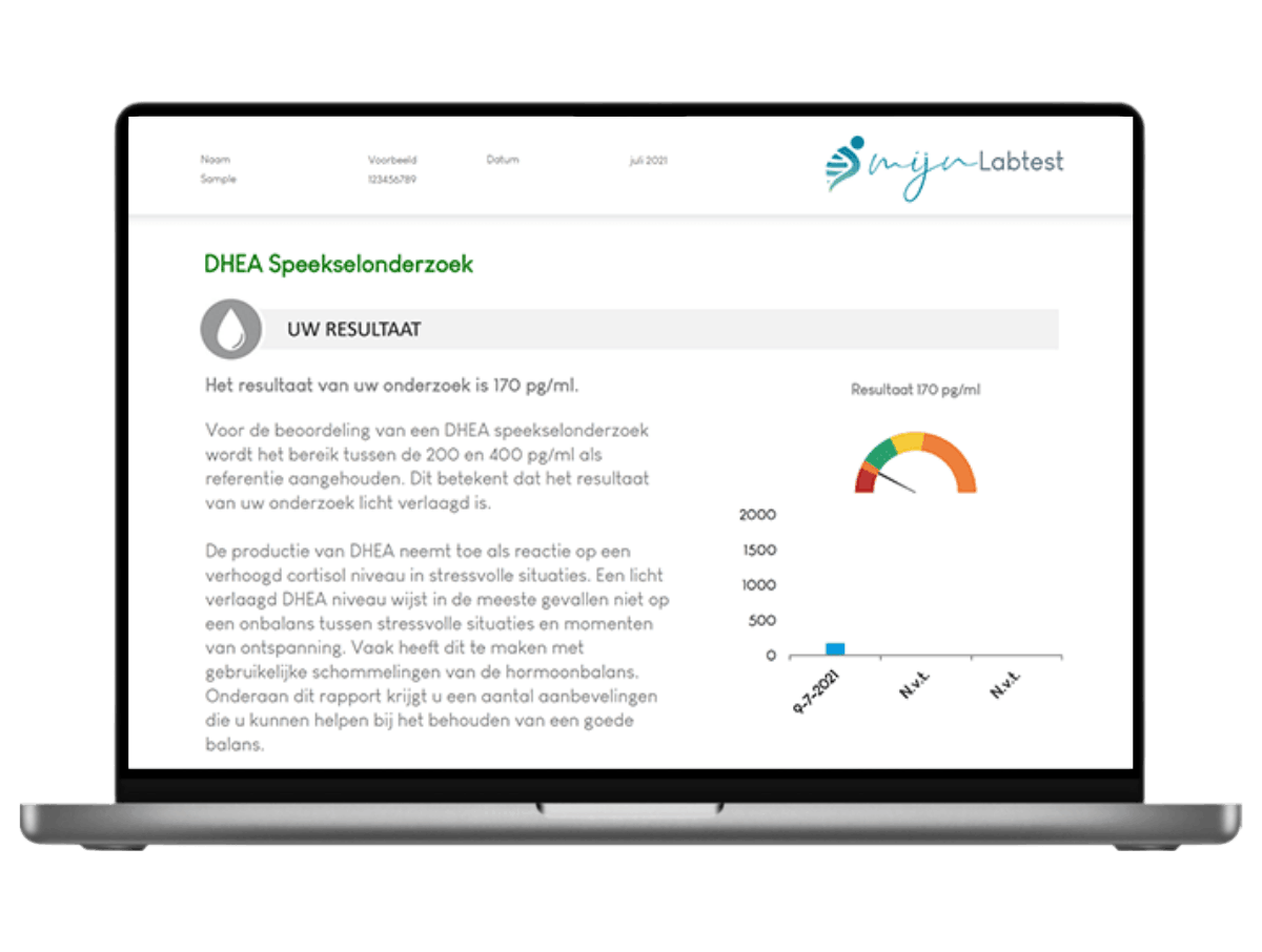 Na afname van de speekseltest DHEA en het retour sturen, ontvang je het resultaat via een beveiligd bericht. In dit resultaat krijg je meer uitleg over het hormoon DHEA, vind je de uitslag en kun je zien wat de uitslag voor jou betekent.