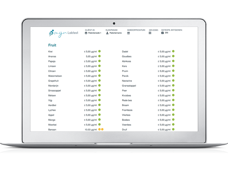 - Vervolgens krijg je per hoofdcategorie specifieke voedingsmiddelen te zien. Bij de categorie fruit zijn dit er bijvoorbeeld 36. Aan de hand van de kleuren kun je zien hoe sterk je reactie is.