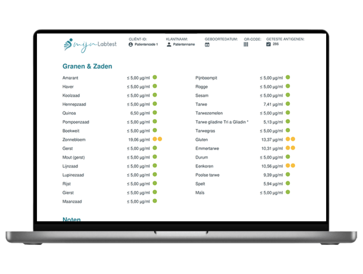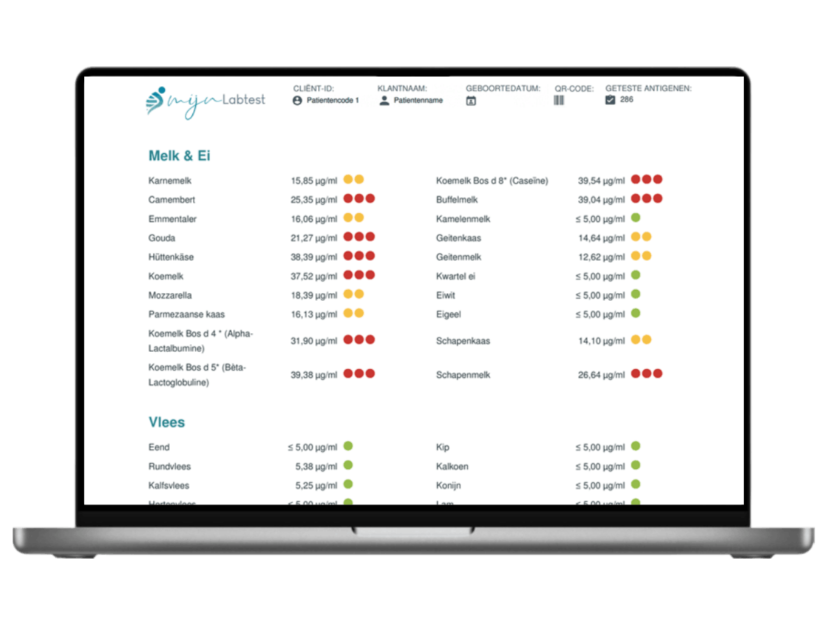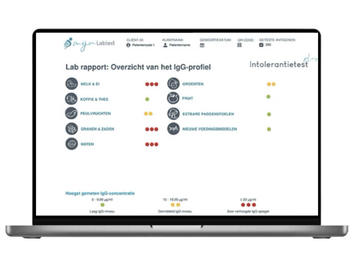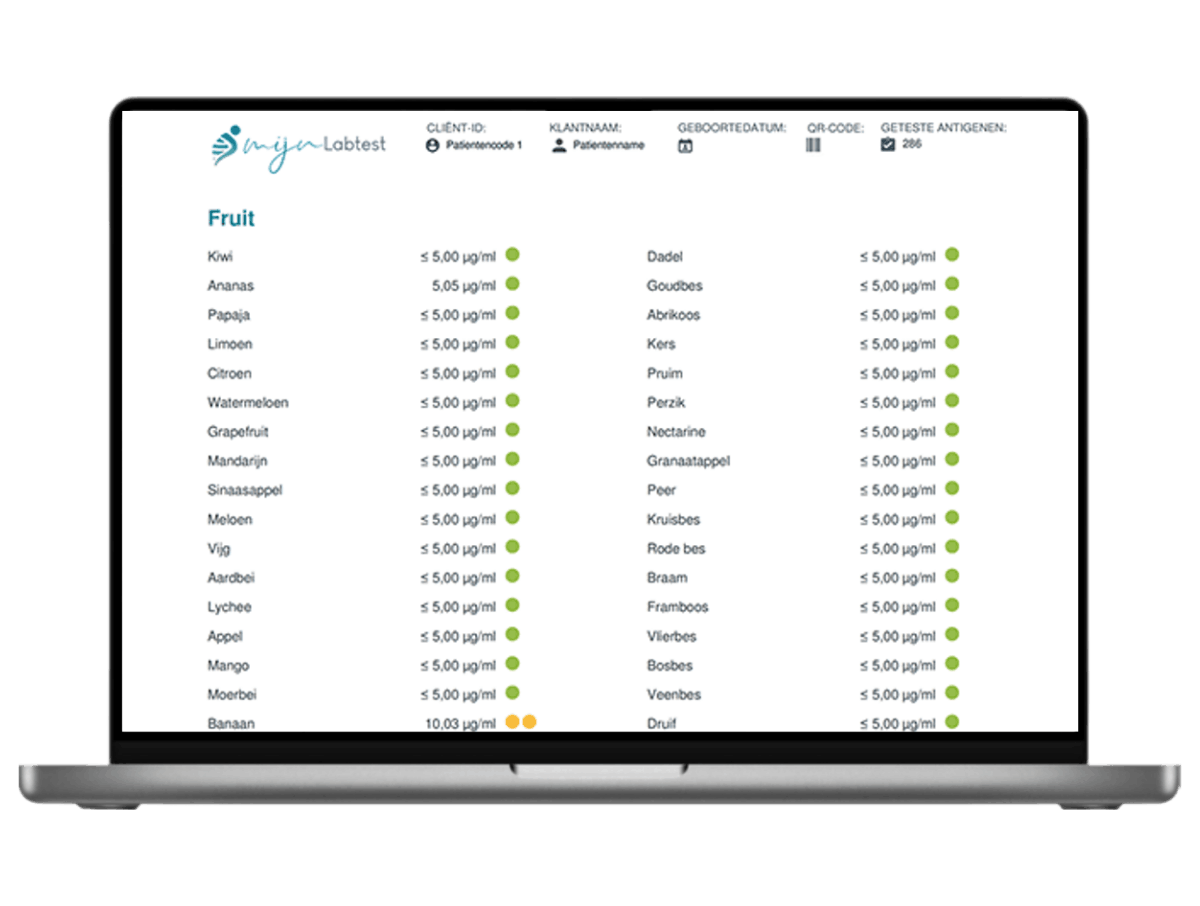 Binnen twee weken nadat je jouw sample terug hebt gestuurd, krijg je en een overzichtelijk rapport geleverd. In het rapport staat de reactie op 195 voedingsmiddelen ingedeeld in overzichtelijke categorieën. Met een duidelijk kleur (groen - geel - rood) is aangegeven hoe sterk je reactie op een bepaald voedingsmiddel is. Onderaan het rapport krijg je aanvullende informatie over alle rood gekleurde voedingsmiddelen met alternatieven. Erg handig, want zo kun je meteen kiezen voor een soortgelijk voedingsmiddel waar je niet op reageert.
