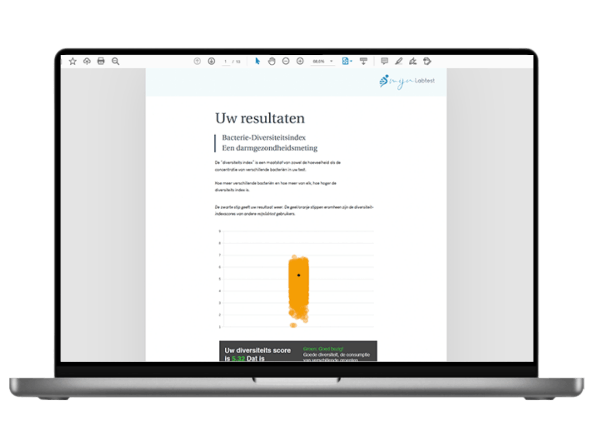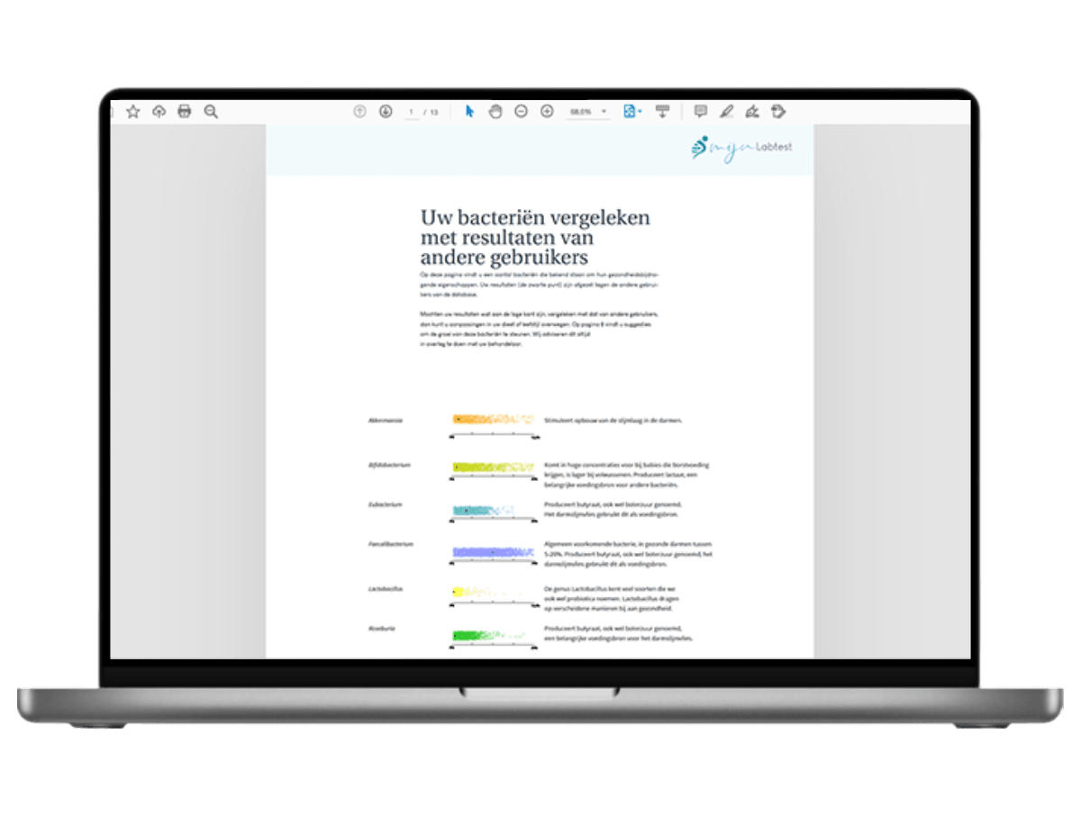 Na 5 weken ontvang je je persoonlijke resultaat, een unieke inzage in aanwezigheid en verdeling van je darmbacteriën.