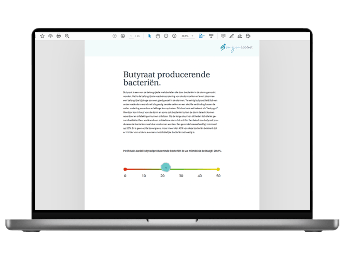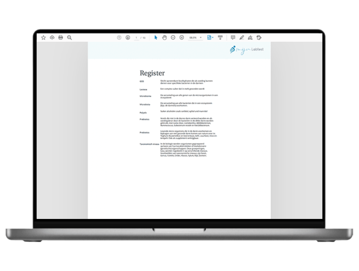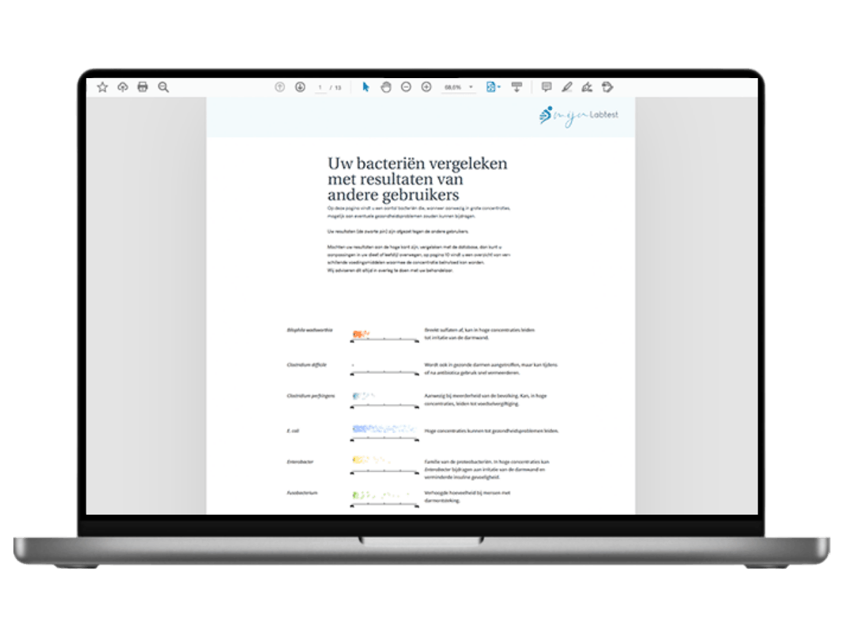 Vijf weken na het retoursturen van je onderzoek ontvangt je het testresultaat via een beveiligd bericht. In de testuitslag wordt het onderzoek uitvoerig uitgelegd. Ook als je niet zo thuis bent in de materie, weet je na het lezen van je uitslag wat microbioom, calprotectine en zonuline zijn en vooral ook wat deze onderwerpen betekenen voor je gezondheid.