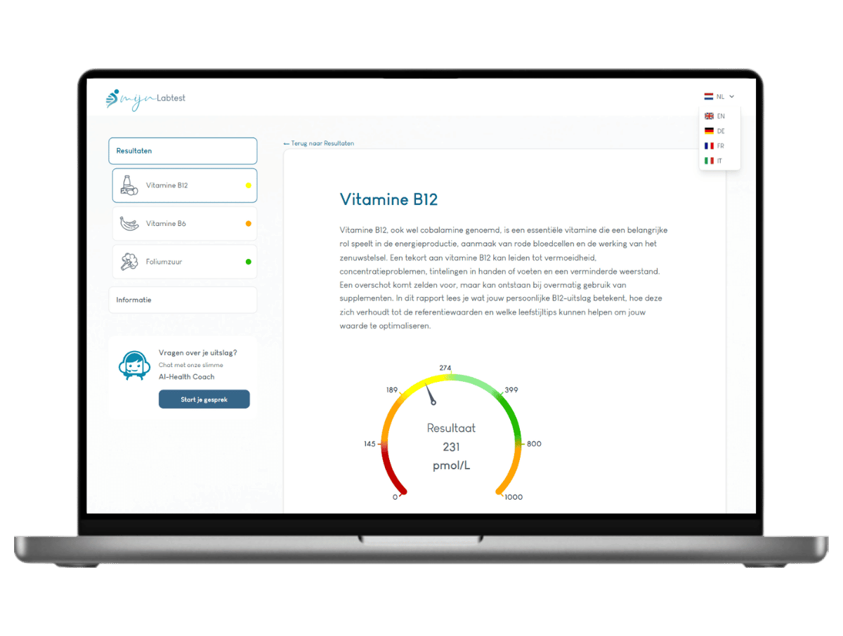 Zo krijg je niet alleen inzicht in je vitamine-B status, maar ook concrete handvatten om eventuele tekorten gericht aan te pakken of je waarden optimaal te houden. Daarnaast krijg je toegang tot onze geïntegreerde AI Health Coach. Hiermee kun je direct chatten over je uitslag en al je vragen stellen, zodat je nog beter begrijpt wat jouw resultaten betekenen.